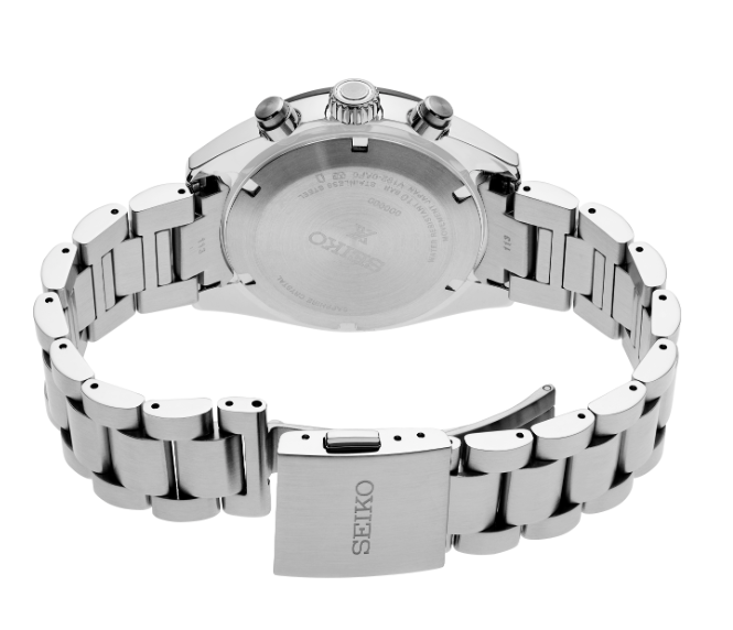 Prospex Speedtimer Solar Chronograph. Designed for those who treat life as the ultimate adventure, Seiko Prospex keeps moving forward, meeting every challenge with technological excellence and winning design. Combining precision timing with wearability and the energy efficiency of solar power, this exceptional watch, inspired by Seiko’s first precision chronographs, developed for international sporting competitions in 1964, provides chronograph measurement of up to 60 minutes of elapsed time in 1/5-second increments and includes a split time function. The solar cell, powered by any light source, with no battery change required, offers a 6-month power reserve when fully charged. Framed by a black tachymeter bezel, the white dial, with distinctive sand-blasted texture, features three black subdials, including a 24-hour indicator, as well as a date calendar and beige LumiBrite hands and markers. In stainless steel, with curved anti-reflective sapphire crystal, this rugged timepiece also offers the security of a screwdown caseback and tri-fold push button release clasp. 10 bar, 100M Water Resistant