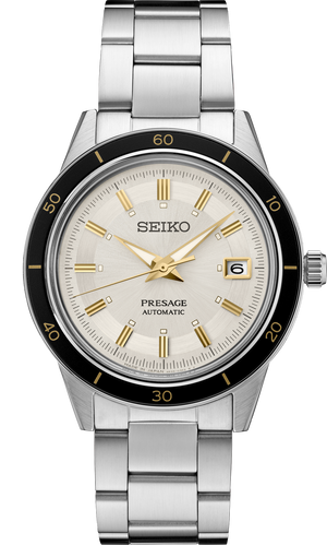 SEIKO SRPG03 PRESAGE 60'S STYLE WHITE DIAL BLACK BEZEL STAINLESS STEEL WATCH
