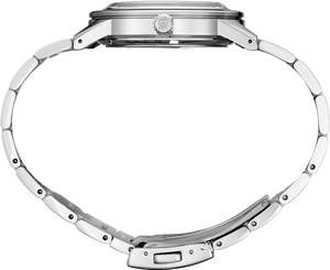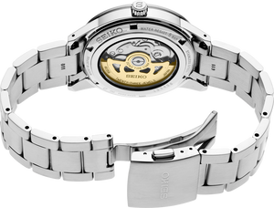 Presage Style60's Collection. Offering the finest in Japanese mechanical watchmaking, the Presage Collection blends precision technology with superior craftsmanship and design. With broad angular lines and such vintage details as box-shaped crystals, faceted indices and sharp hand design, plus the use of neutrals and earth tones, the Style60's collection creates a warm, retro feel perfect for today. Celebrating the fresh spirit of the 1960s, the collection takes particular inspiration from Seiko’s 1964 “Crown Chronograph,” Japan’s first watch with a stopwatch function. Framed by a black bezel with gold accents, the ivory dial includes a date calendar and LumiBrite hands and markers. The screwdown see-through caseback provides a view of the 23-jewel movement with manual winding capability, a frequency of 21,600 vibrations per hour and a power reserve of approximately 41 hours. Crafted of stainless steel, this distinctive timepiece includes a tri-fold push button release clasp. 5 bar, 50M Water Resistant